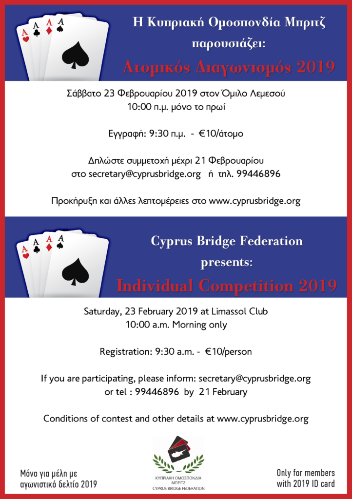 The Cyprus Bridge Federation represents the game of Bridge internationally, in accordance with the current regulations of the Cyprus International Sports Federation and the Cyprus International Olympic Committee.