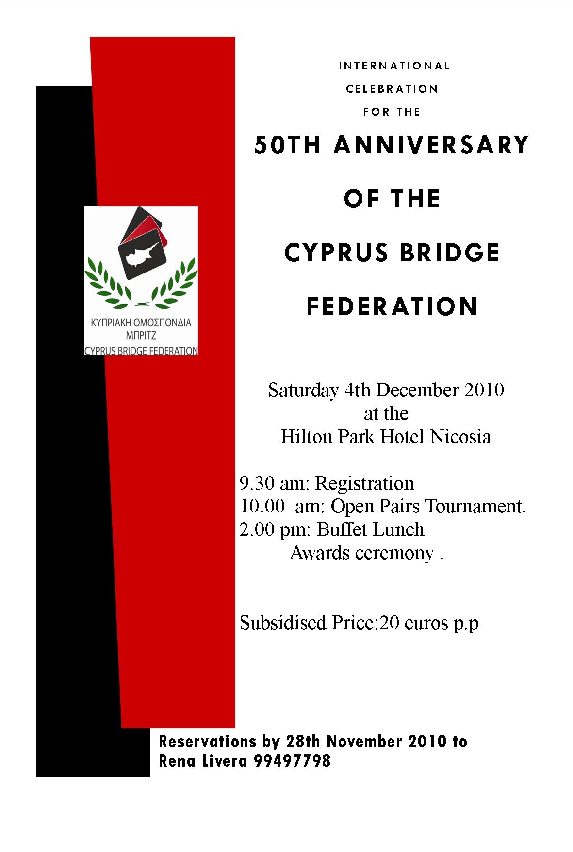 To celebrate this fact and to honour those people who have contributed so much to its establishment and success the CBF hosted an International Bridge Event on Saturday 4th December 2010 at the Hilton Park Hotel in Nicosia.